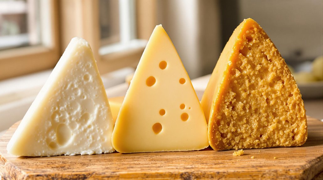 During aging periods, proteins and fats continue breaking down, creating firmer textures and more pronounced aromas. This process reduces moisture content while extending shelf life. You'll notice that longer-aged cheeses generally provide more robust flavor profiles with crystalline textures.