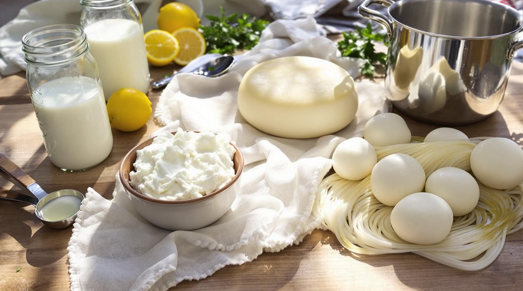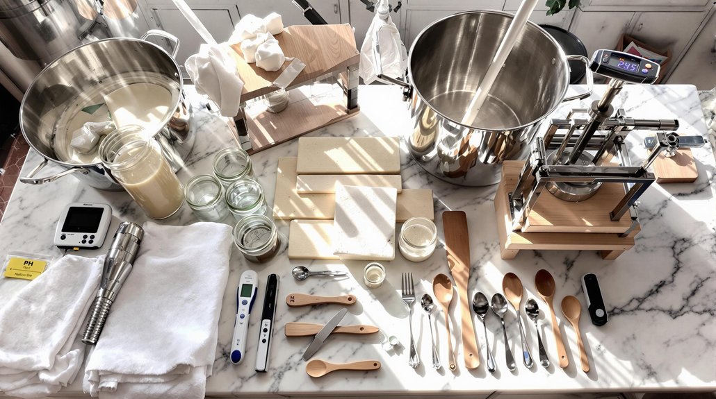 For beginner cheese-making, you'll need a stainless steel, heavy-bottomed pot for even heating, precise measuring tools, and a digital dairy thermometer with probe for temperature monitoring. Don't forget curd knives or icing spatulas for cutting, plus cheesecloth (grade 90) and draining mats for proper moisture removal. Molds and presses help shape your cheese, while proper sanitization equipment guarantees food safety. The right tools will transform your kitchen into a successful home creamery.