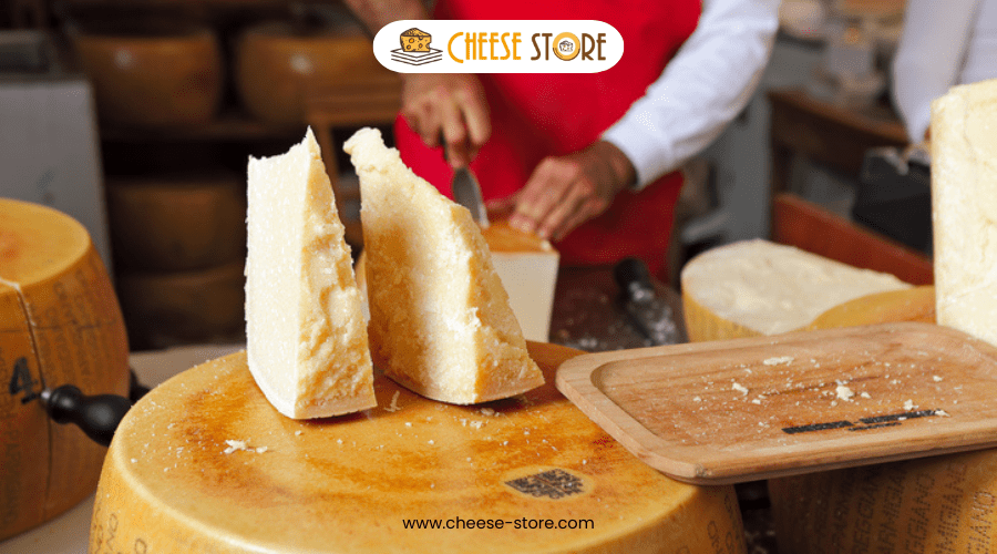 During aging, the wheels are stored in temperature-controlled environments where they are regularly turned and inspected. This manual care helps the cheese age evenly. The longer it ages, the more moisture it loses, leading to a crumbly texture and concentrated flavor.