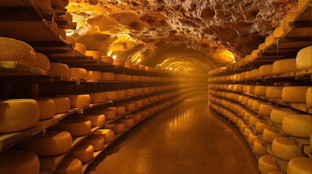 The Cheddar cheese caves are ancient limestone caverns in Somerset, England, where cheese makers have aged their products for over 850 years. You'll find these natural caves in the Mendip Hills, maintaining a perfect 11°C temperature and 100% humidity year-round. Since 2006, they've revived traditional cave-aging practices, producing award-winning Cheddars that mature on wooden boards for 3-12 months. There's much more to uncover about these extraordinary geological and culinary treasures.