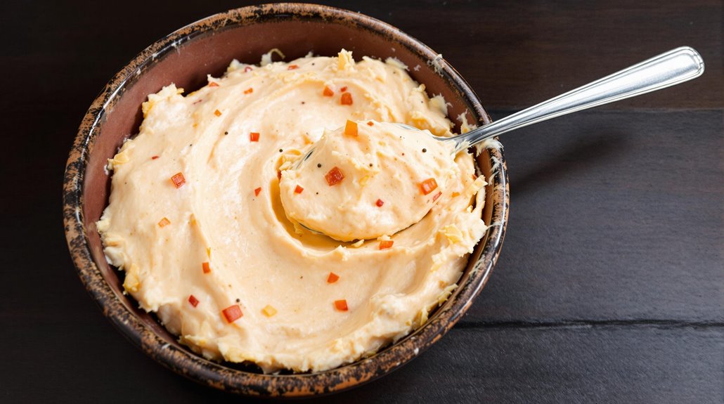 You'll find pimento cheese, often called the "caviar of the South," to be a rich and creamy spread that combines sharp cheddar cheese, mayonnaise, and sweet pimento peppers. It's perfect on crackers, sandwiches, or as a dip for vegetables. While it originated in the early 1900s as a Northern creation, this beloved comfort food has become a Southern staple that's now enjoyed nationwide. There's much more to explore about this versatile cheese spread's fascinating path and regional variations.