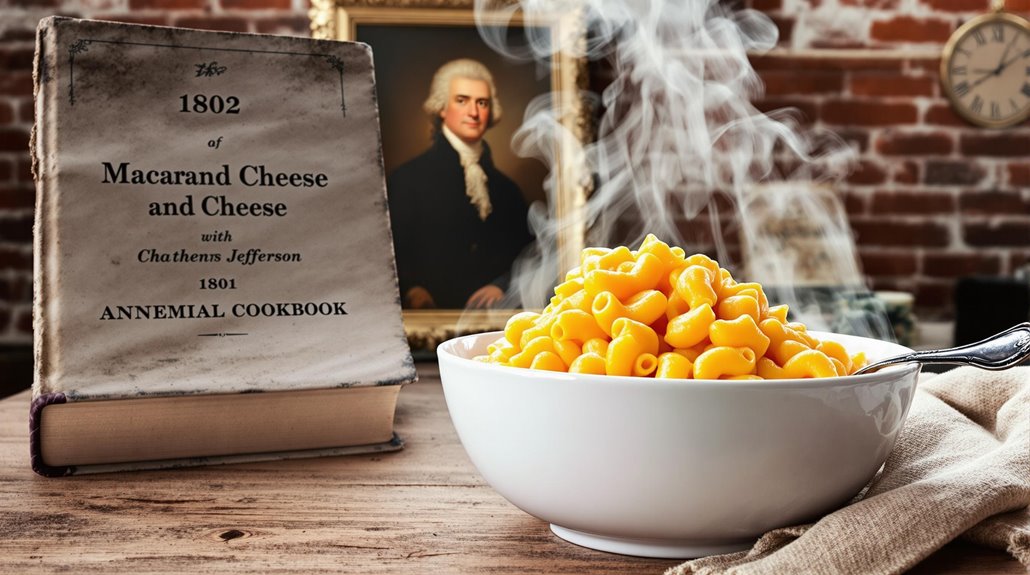 French culinary influence altered macaroni and cheese into a more refined dish before it reached American shores. You'll find that Thomas Jefferson played a pivotal role in its American expedition when he imported pasta and Parmesan cheese from Europe to Monticello. His enslaved chef, James Hemings, who trained in French cuisine, perfected the recipe and passed this knowledge to his brother Peter.